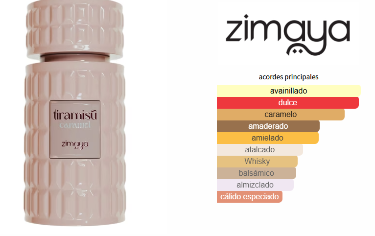 Tiramisu Caramel de Zimaya es una fragancia de la familia olfativa Oriental Vainilla para Hombres y Mujeres. La Nota de Salida es caramelo; las Notas de Corazón son miel, cumarina y notas amaderadas; las Notas de Fondo son vainilla, whisky y almizcle.
