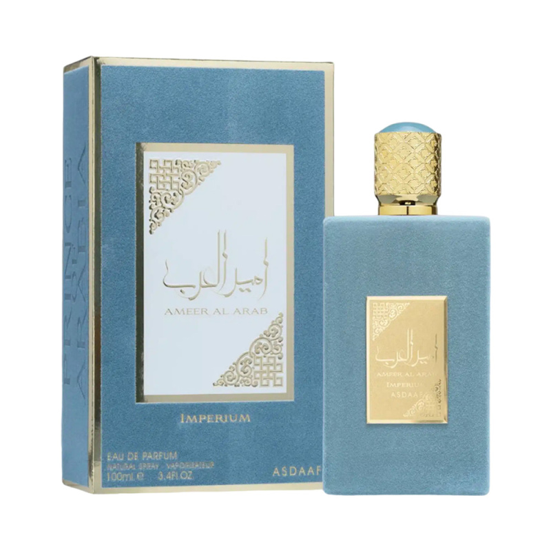Ameer Al Arab Imperium de Asdaaf es una fragancia de la familia olfativa Amaderada Aromática para Hombres. Esta fragrancia es nueva. Ameer Al Arab Imperium se lanzó en 2024. Las Notas de Salida son bergamota, jengibre y salvia; las Notas de Corazón son manzana, cachemira y geranio; las Notas de Fondo son ámbar, almizcle y sándalo.