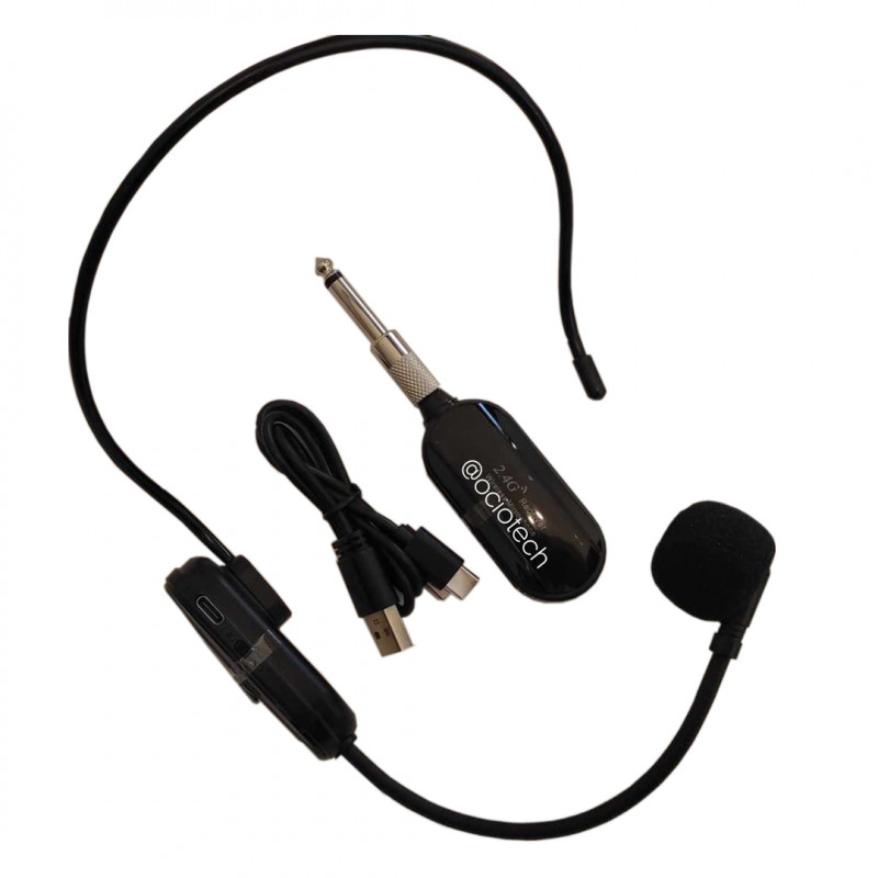 Incluye: micrófono, transmisor, adaptador 3.5 a plug, cable USB C para carga.