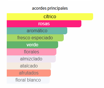 Las Notas de Salida son ruibarbo, toronja (pomelo), bergamota y nuez moscada; las Notas de Corazón son rosa y jazmín; las Notas de Fondo son almizcle, vainilla, vetiver y ámbar gris.