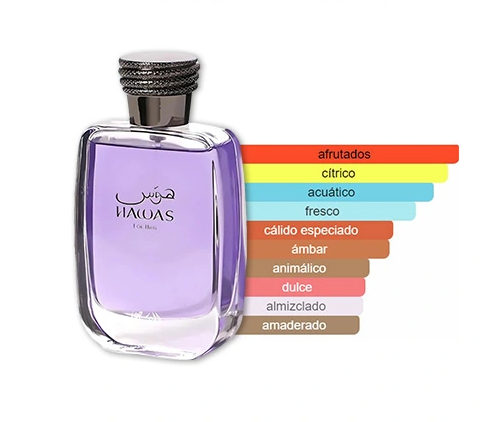 Hawas for Him de Rasasi es una fragancia de la familia olfativa Aromática Acuática para Hombres. Inspirado en Invictus dePacco Rabanne, se lanzó en 2015. Las Notas de Salida son manzana, bergamota, limón (lima ácida) y canela; las Notas de Corazón son notas acuosas, ciruela, flor de azahar del naranjo y cardamomo; las Notas de Fondo son ámbar gris, almizcle, pachulí y trozos de madera a la deriva.
