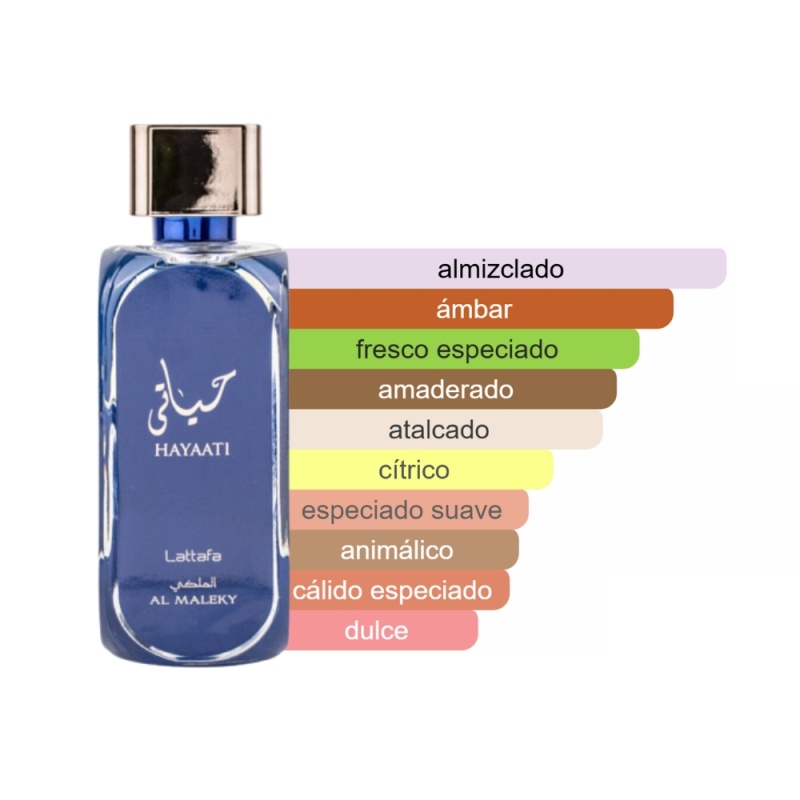 Hayaati Al Maleky de Lattafa Perfumes es una fragancia de la familia olfativa Oriental Especiada para Hombres y Mujeres. Hayaati Al Maleky se lanzó en 2022. Las Notas de Salida son pimienta rosa, nuez moscada, bergamota y jengibre; las Notas de Corazón son cedro, notas amaderadas, incienso y ládano; las Notas de Fondo son almizcle, ámbar y ámbar gris.