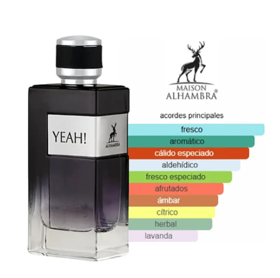 Yeah! de Maison Alhambra es una fragancia de la familia olfativa Arom谩tica Frutal para Hombres. Yeah! se lanz贸 en 2023. Las Notas de Salida son manzana, bergamota y jengibre; las Notas de Coraz贸n son salvia, bayas de enebro y geranio; las Notas de Fondo son Amberwood, haba tonka, cedro, vetiver y incienso de ol铆bano (franquincienso).